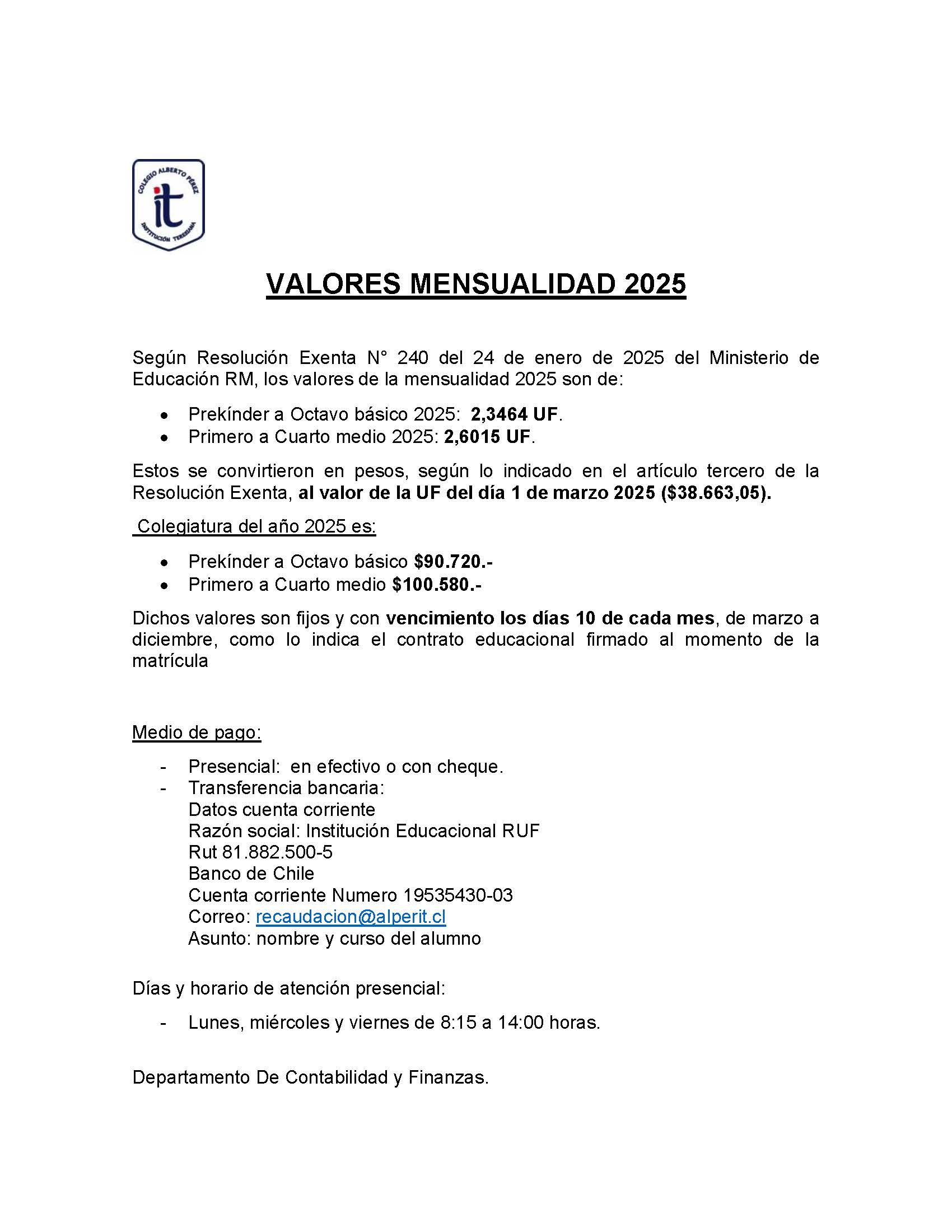 Valores Mensualidad 2025